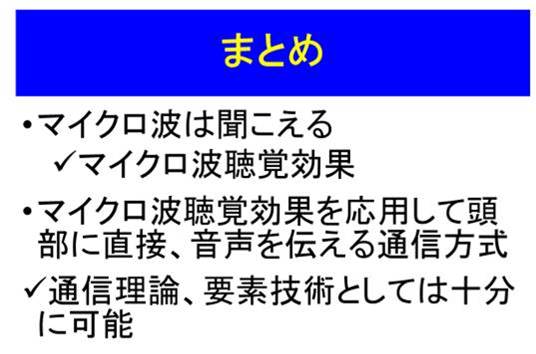 「2台のマイクロ波発信機から放射されたマイクロ波がマイクロ波可聴効果を発生するほどに強ければ、二つのマイクロ波が重なり合う場所で、鼓膜経由ではなく、脳でカリカリと言った音は聞こえるが、意味のある言葉は聞くことは困難」とは言える。